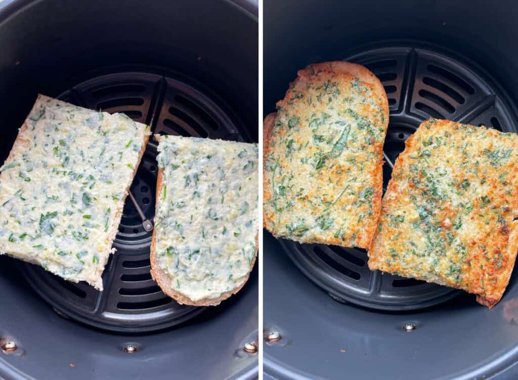 - Air fry for about 5 minutes. The bread should be light brown and crispy. I’d check it after 3 minutes because all air fryers cook differently.